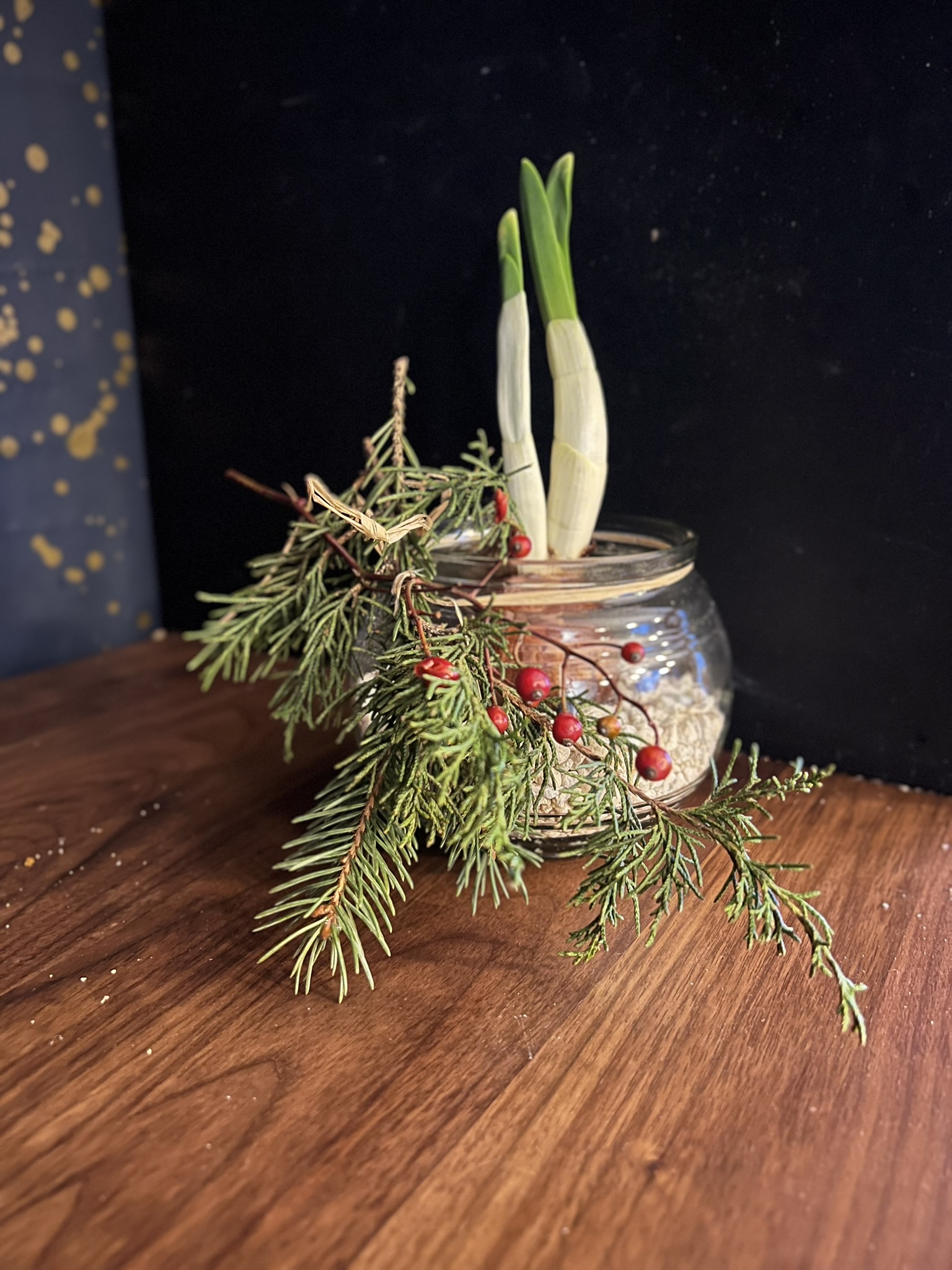 Single Paperwhite ‘Nir’ bulb in a 5″ glass bowl with white stones and holiday greenery and wild rose hips.