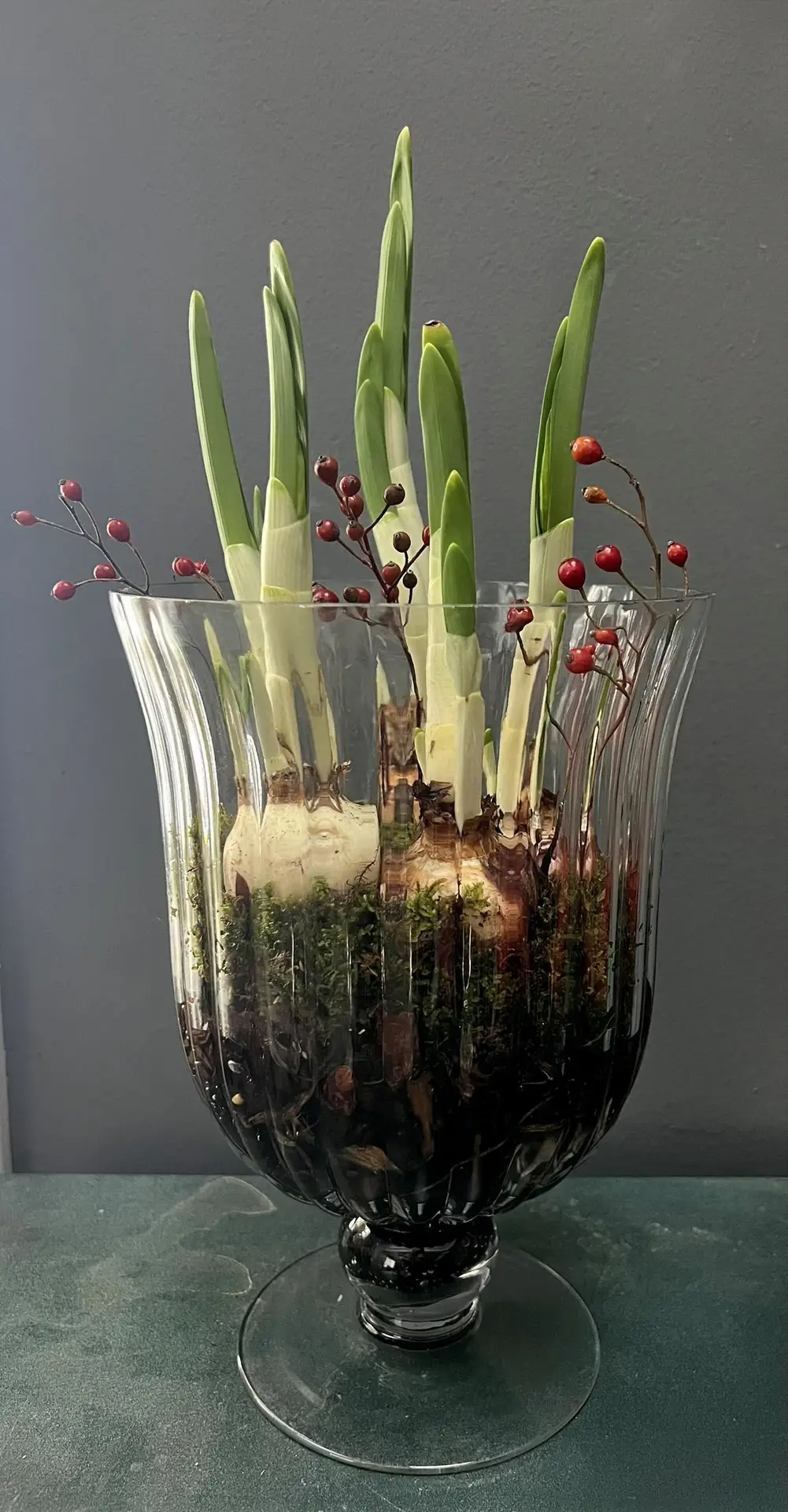 Includes four ‘Paperwhite Nir’ bulb ready to grow, one 10 inch fluted glass vase, orchid bark bed, charcoal, and moss.