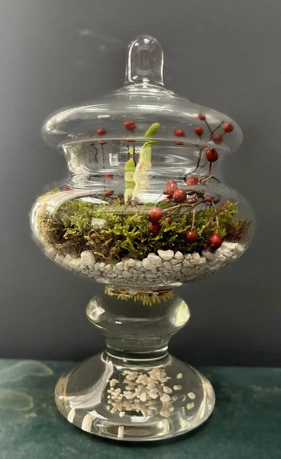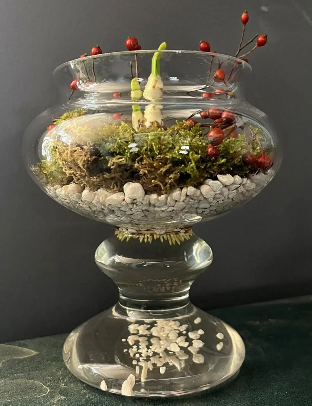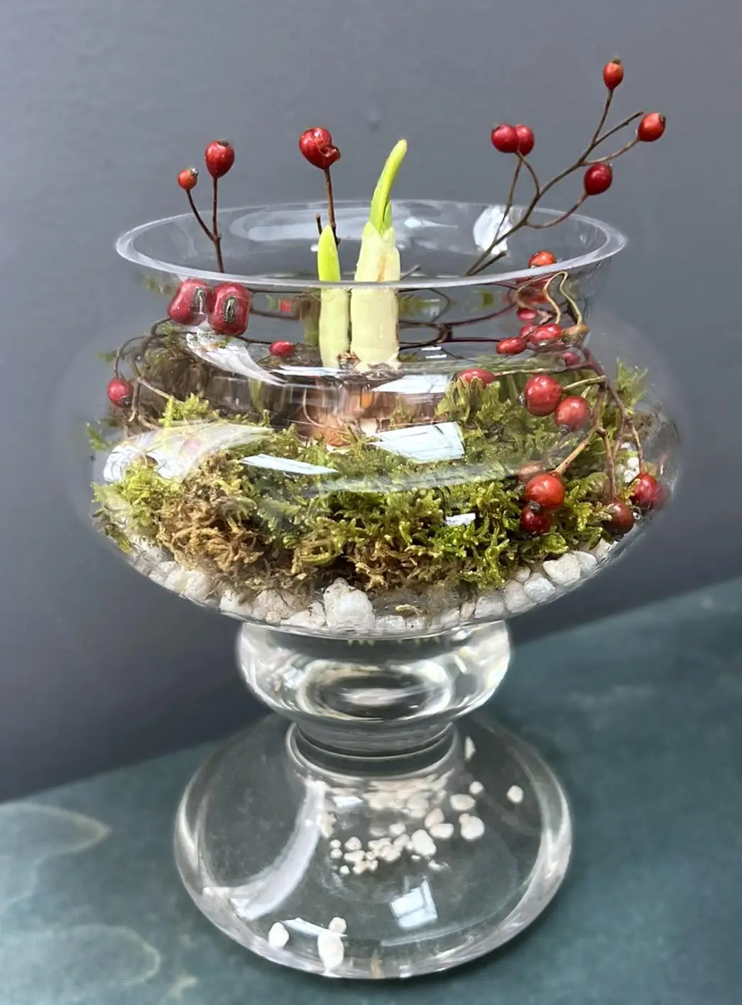 Includes one ‘Paperwhite Nir’ bulb ready to grow, one 9.5 inch glass apothecary pedestal jar with lid, one cup white gravel bed, and moss.